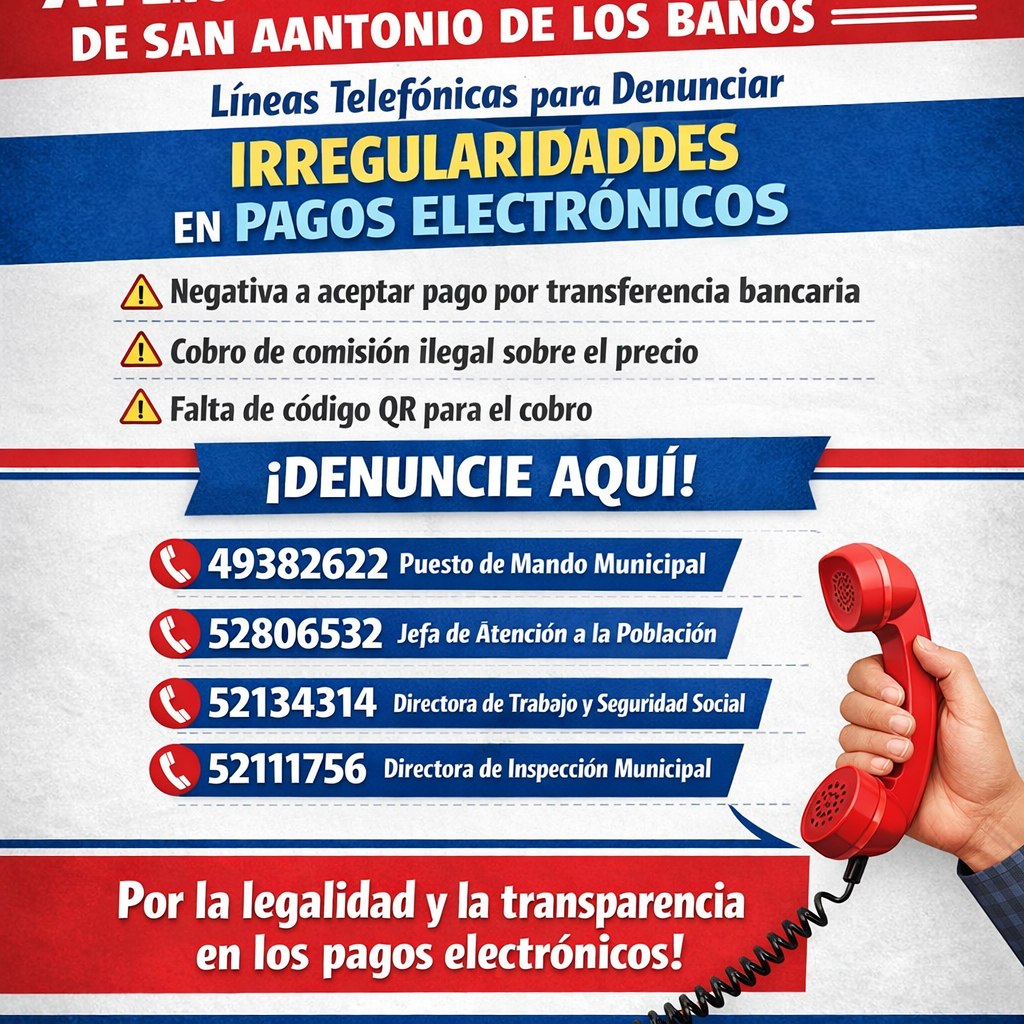 San Antonio de los Baños, Artemisa, Cuba. – En el Ariguanabo la población cuenta ahora con tres números telefónicos para presentar quejas sobre el incumplimiento de las normativas relacionadas con pagos electrónicos y transferencias bancarias en comercios y servicios no estatales.