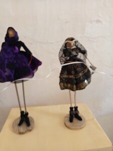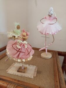 Las primeras muñequitas eran de alambre y materiales reciclados: telas regaladas, ropas viejas, cintas y lazos. Con el tiempo, evolucionaron hacia nuevas colecciones. “Otras de las que fui haciendo no tienen ojos, nariz ni boca. La carita las hago con cartón de huevo, lo mojo, lo hago bolita y lo forro con papel de periódico. A veces les pongo pelo de papel o les hago un sombrero.” Esa experimentación constante dio paso a «Mujercitas», una colección que incluye piezas de diferentes tamaños.