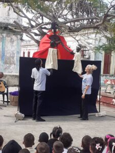 En conversación con Malawy Capote Directora de la Compañía, comentó a nuestra redacción digital: «… después de un tiempo bastante prolongado de no podernos presentar, hoy aquí han acudido las escuelas, los niños públicos en general, que nos quiere, que nos sigue, y hemos pasado una mañana inolvidable. Hoy precisamente celebrando el Día Mundial del Teatro para Niños y Jóvenes, y mañana, 21 de marzo, se celebra el Día Internacional de la Marioneta. También celebramos el Día del Síndrome Down, la llegada de la primavera, la poesía y el Día de la Alegría. Entonces creo que son más que razones suficientes para estar felices. El público creo que agradece muchísimo, creo no, estoy segura que agradece muchísimo cada vez que los cuenteros, con esta alma tan grande que tenemos, llevamos a la escena la alegría, la felicidad (…)»